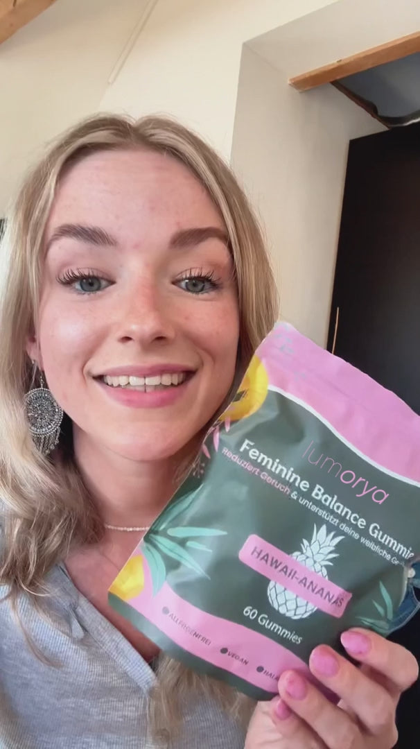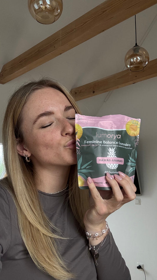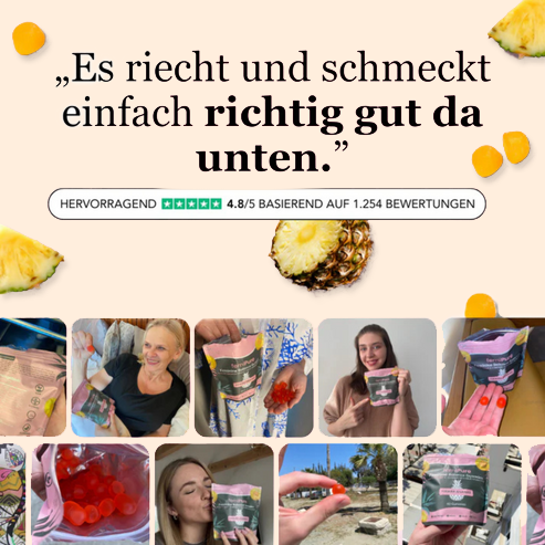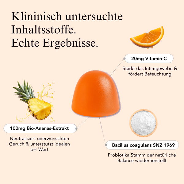 Dank des klinisch getesteten probiotischen Stamms Bacillus Coagulans und natürlichem Ananasextrakt unterstützen die Gummies das natürliche pH-Gleichgewicht, beugen bakteriellen Ungleichgewichten vor und sorgen für ein angenehmes Frischegefühl – Tag für Tag.